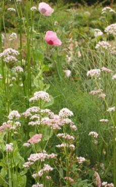 gran. Men de limegrønne blom-sterskærme kunne live vældigt op længere hen på sæsonen. Værd at prøve er også knoldet mjødurt med lette, hvide blomsterduske. På den flimrende baggrund er det fristende at indføre mere stoflige blomster. Valmuer er selvskrevne, så opiumsvalmuer med gråblåt løv er oplagte. De er enårige, men drysser man lidt modne frø på bare pletter med oprevet jord, skal de nok komme.